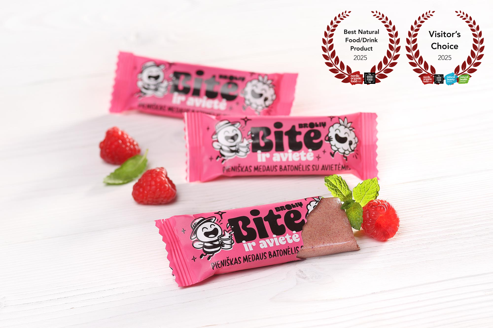 „Brothers“ Bee and Raspberry is a bar that combines the mild sweetness of honey with the slightly sour taste of freeze-dried raspberries. Raspberries make up 7 % of the formulation and give a bright berry aroma and a natural pink colour.